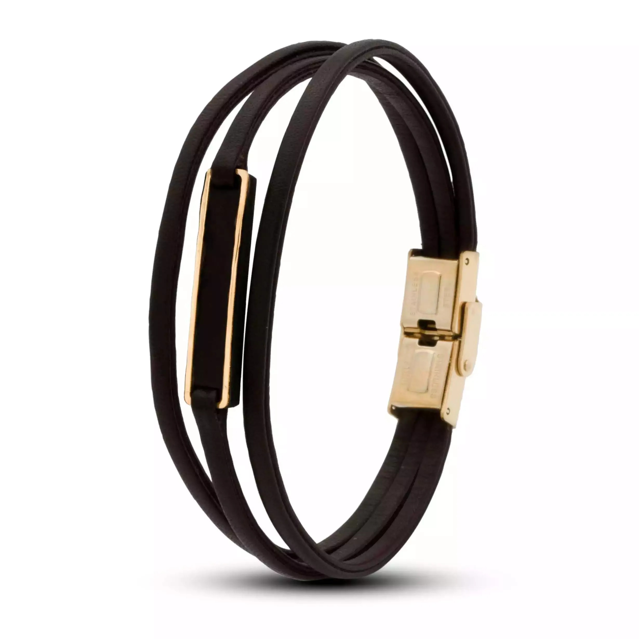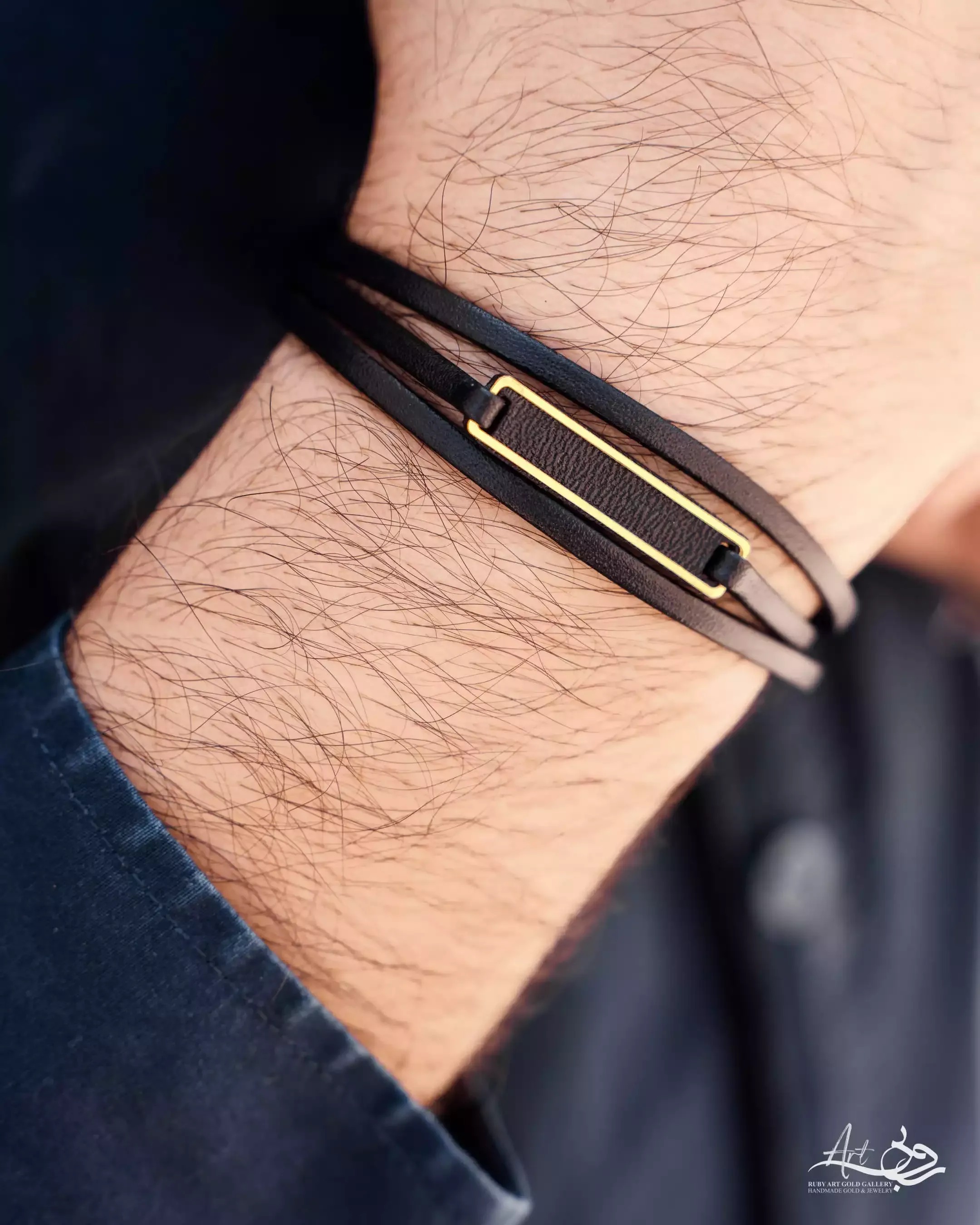 دستبند چرم قهوه ای با پلاک طلا 18 عیار طرح دو لاین 100001478