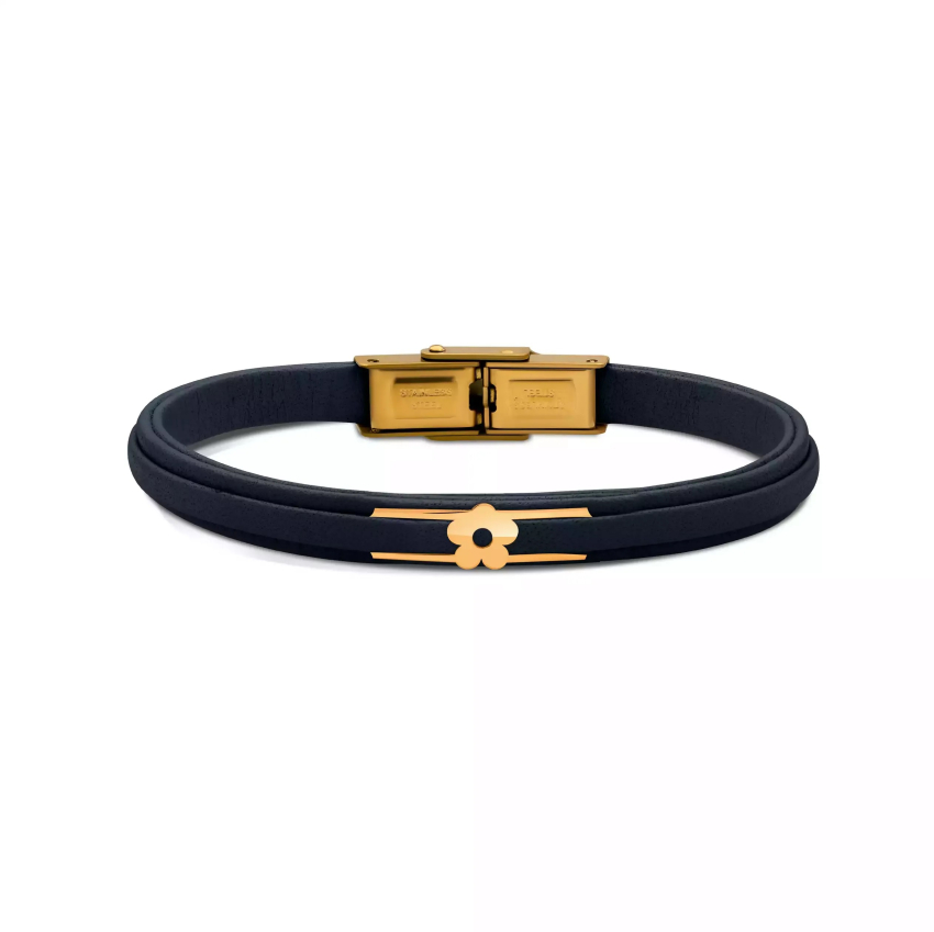 دستبند چرم مشکی لاین و گل طلا 18 عیار 100001428